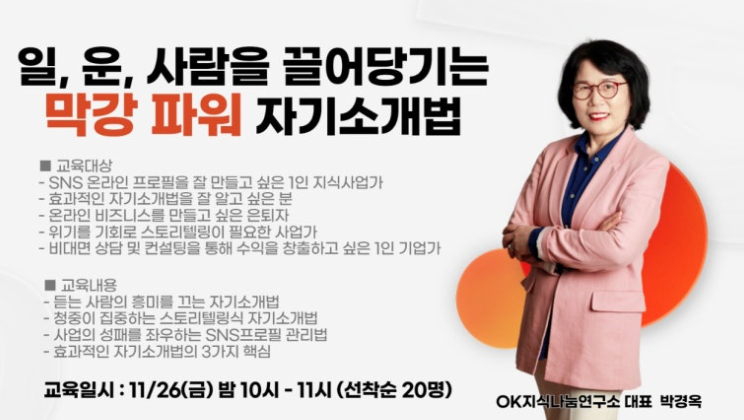 - ‘OK지식나눔연구소’ 브랜드를 세우고, 《막강 파워 자기소개법》 전자책 집필 및 특강 개설
